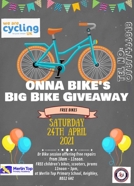 Onna Bike’s Big Bike Giveaway taking place on Saturday 24th April 2021 at Merlin Top Primary School, Keighley